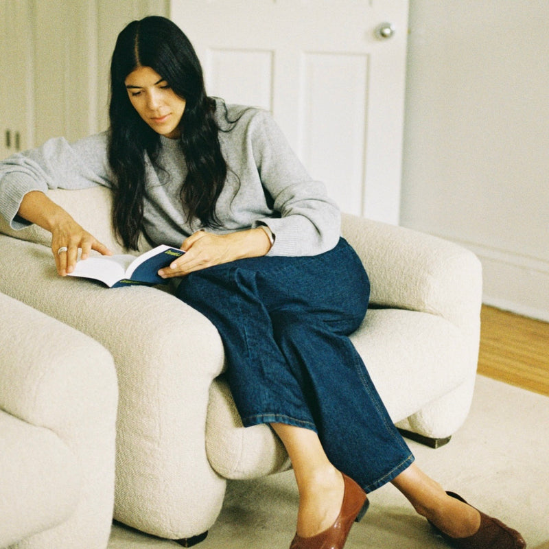 Looking at her library, we talk about books. “I was bookish and creative growing up,” she confesses. When asked about her favorite ones, she tells us: “I love books, and I always find it impossible to narrow it down to a few favorites—but a few that immediately come to mind are Ways of Seeing by John Berger, a great book I reread every few years for its lessons on perspective in art and life; The Poetics of Space by Gaston Bachelard, which explores the emotional and imaginative resonance of intimate spaces—our homes, rooms—in shaping our memories, dreams, and sense of self; and The Bluest Eye by Toni Morrison, an incredible novel that confronts the devastating impact of internalized oppression and unattainable beauty standards.”