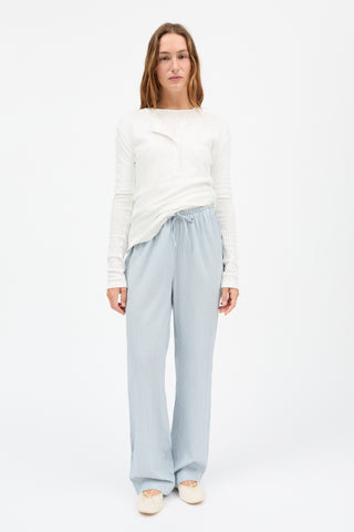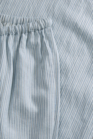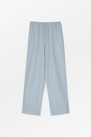 Aude Pants are an easy and stylish pair of pull on trousers with side pockets. Made from 100% organic cotton in a fine blue stripe, they have a firm but comfortable elasticated waist and a self fabric drawcord that can be tied at the front.