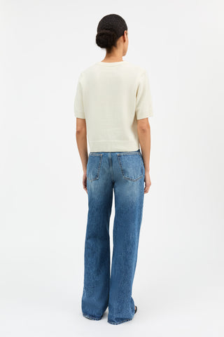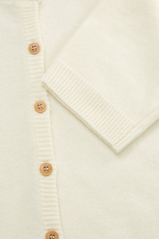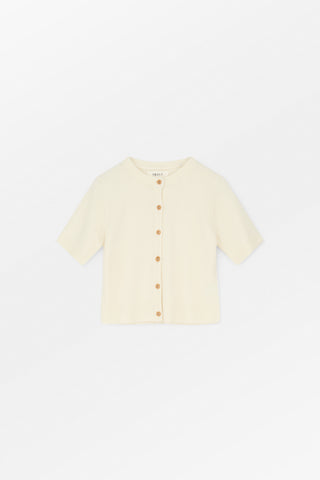 Elegant short-sleeved cardigan with round neck and fine rib details.