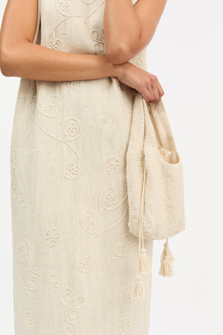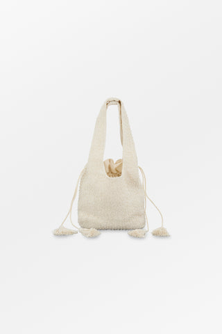 Fountain bag is an elegant bag made from linen and dotted all over with pearl-like beads. It has an inner bucket bag attached that can be drawn closed by cords that end with decorative tassels.