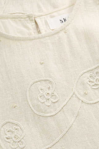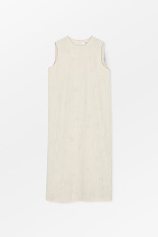 Fountain dress is a sleeveless linen dress covered entirely in a swirling tape embroidery and scattered with tiny glass beads. It has a round collar and has a body-skimming silhouette that falls to mid calf. It is fastened at the back neck with a button and there is a slit at the hem for ease of movement.