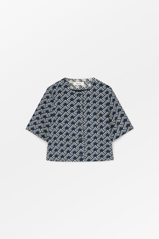 Hill Blouse is a cropped length collarless top with wide t-shirt style sleeves. It buttons up down the front, has slits at the side and shoulder seams that have been brought forward slightly. It is made of 100% organic cotton.