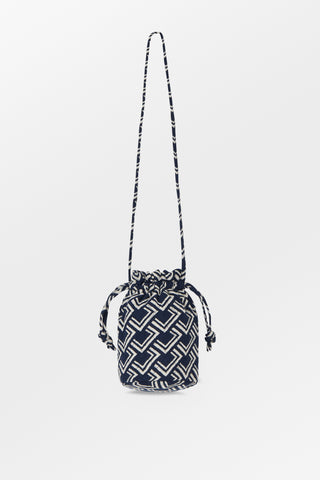 Jolie Bucket Bag is a stylish quilted bag made from 100% cotton. It hangs from a self fabric strap made from a roulou loop, long enough to wear over the shoulder, and it can be drawn closed by a drawcord finished by knots. The bag is fully lined.
