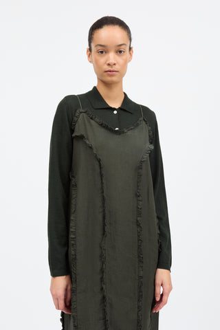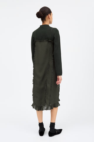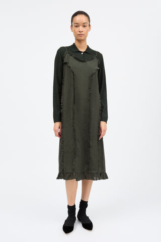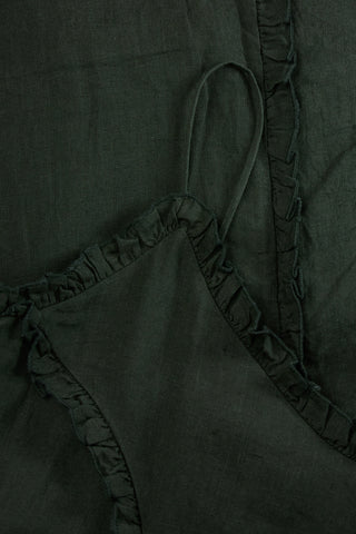 Madeleine Dress is a dress suspended from adjustable spaghetti straps which falls to mid leg. Delicate single-layer ruffles, finished neatly with baby-lock stitching, run around the neck and hem and are set into pin-stitched seams down the front, sides and back.
