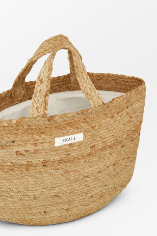 Medium-sized braided jute bag with short handles and a front logo.