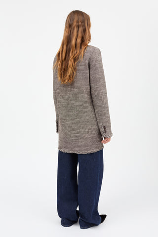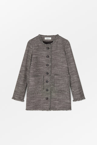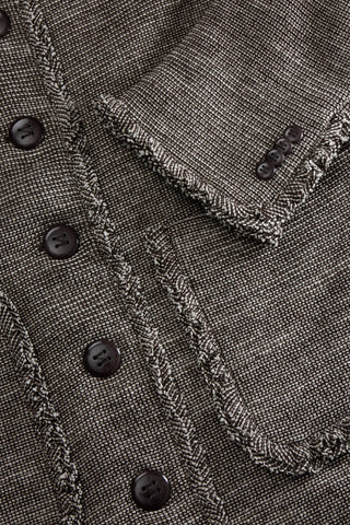 Rosa Blazer is a fitted round neck jacket with five buttons down the front and four on each cuff. Made from wool, the jacket has raw edged bias tape at the neck, hem and cuffs and there are two raw edged taped welt pockets at the waist. The jacket is lined in the body.