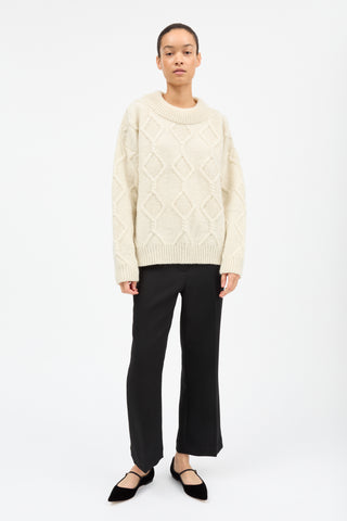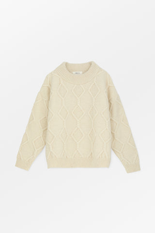 Skagen Jumper is a cosy cabled sweater in 100% wool. It has a deep round neck in double layered rib. Wide ribbed edges finish the sleeves and hem. The jumper is oversized fit with a dropped shoulder.