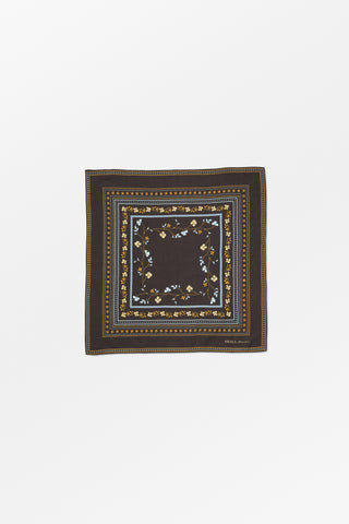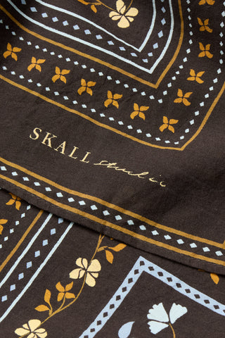 Skall Floral Scarf is a small 100% cotton scarf in a design that features delicate flowers inside a square border. It is the perfect finishing touch to an outfit when tied around the neck.