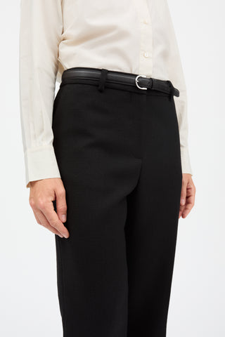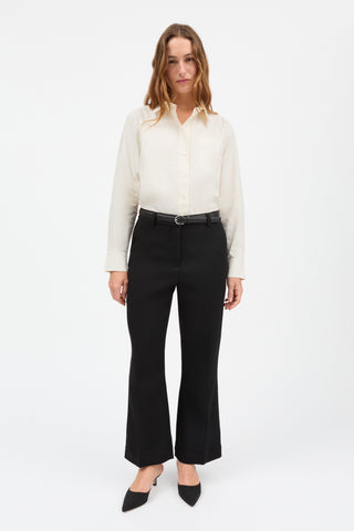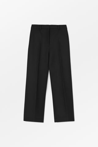 Wallace Trousers are a classic pair of pants that are low-waisted, fitted over the hips and gently flared to ancle-length. Closed with a zip and double-hook, they have two side pockets and a welt pocket at the back. Belt loops are a practical finishing touch and creases down the front gives an air of elegance.